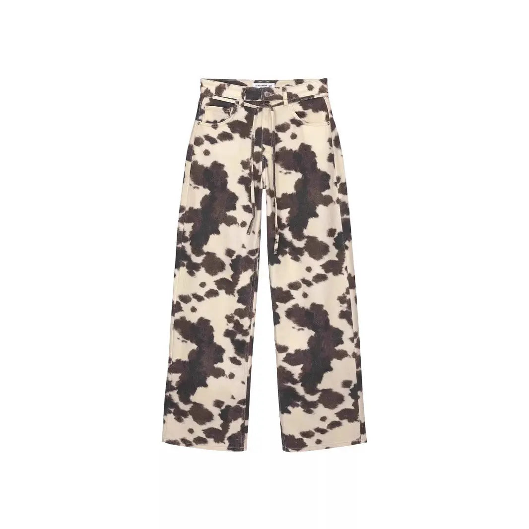 Womens Retro Washed Denim Jeans With Cow Print